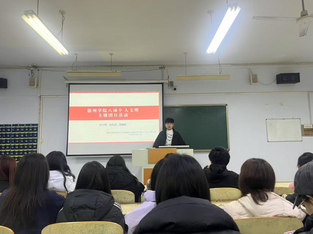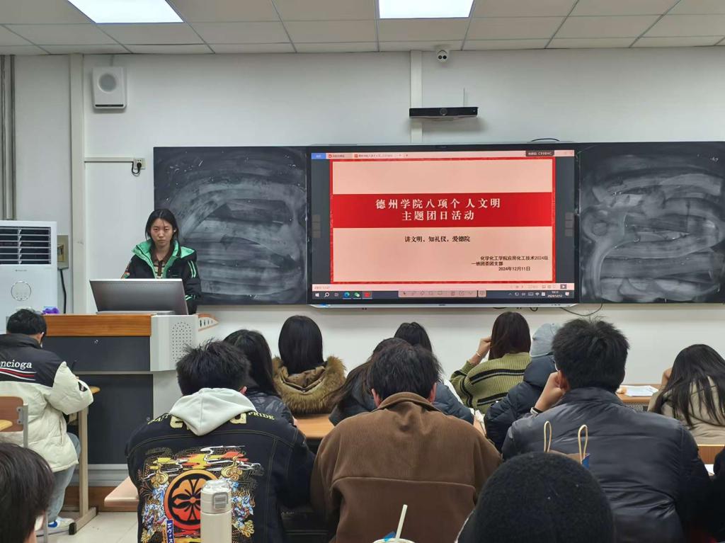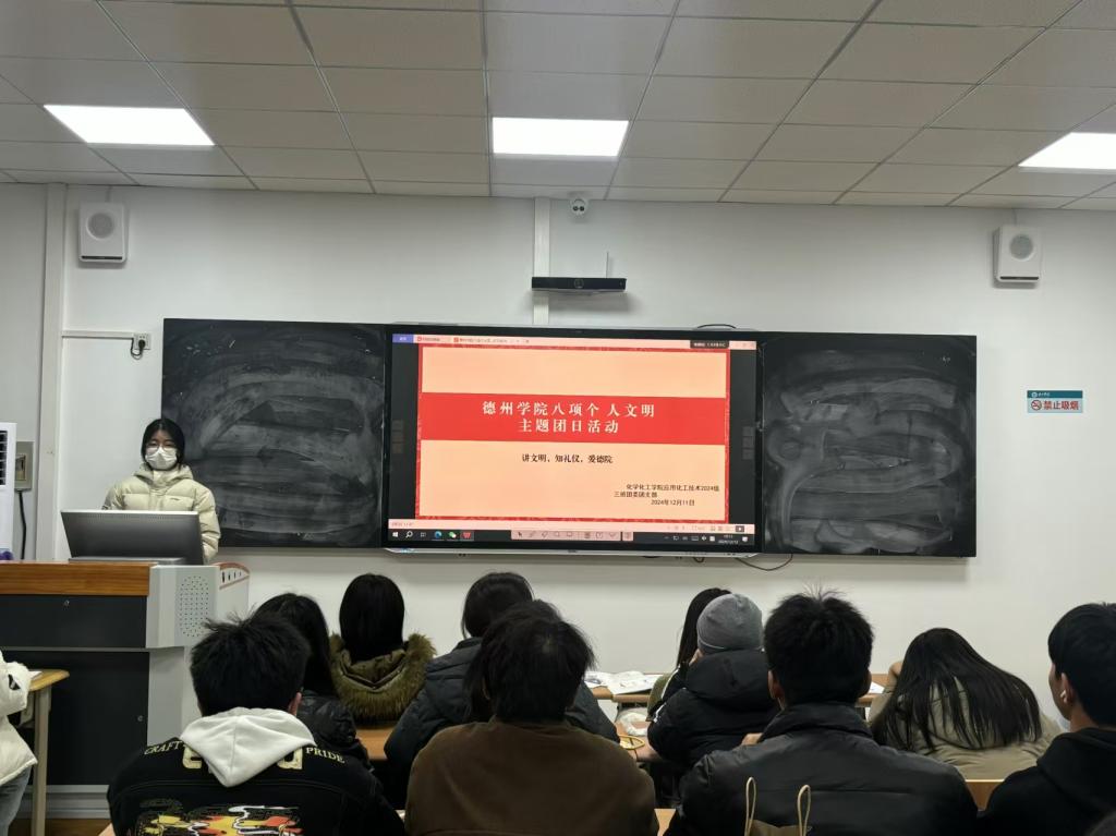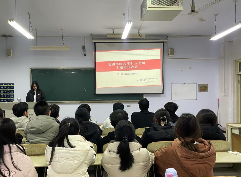 为贯彻落实党的二十届三中全会精神,加强我院大学生思政工作,强化文明养成与校风学风建设。12月10日,人人爽人人爽于求实楼开展“八项个人文明”主题团日活动。各班团支书主持,人人爽人人爽全体学生参加。