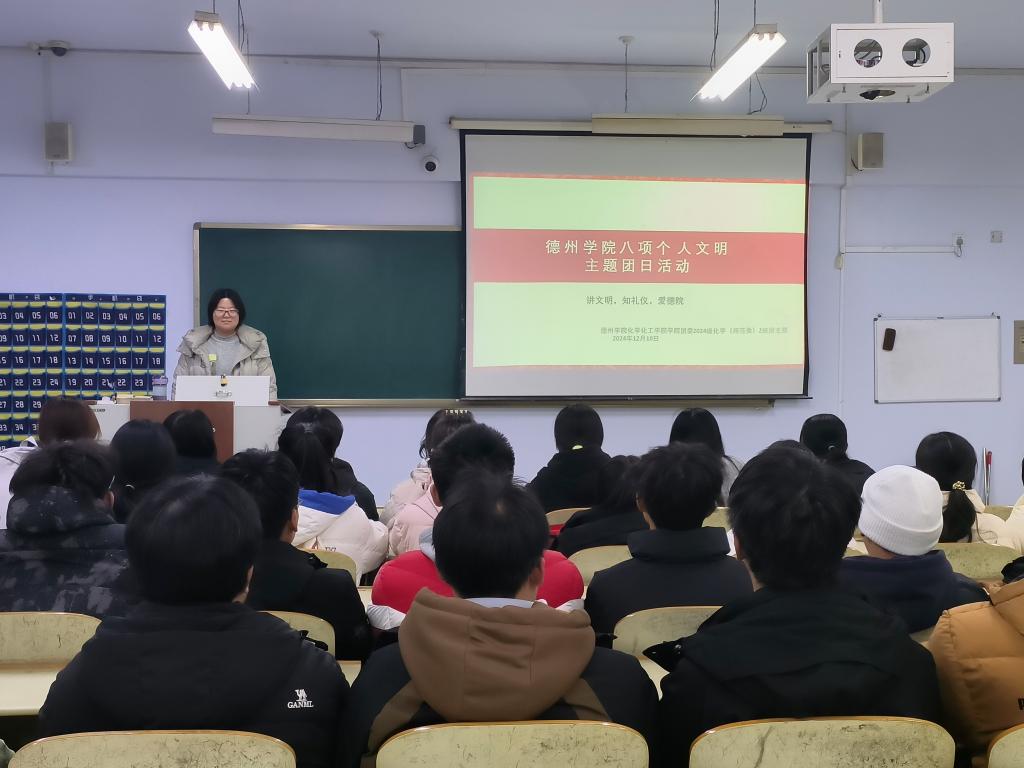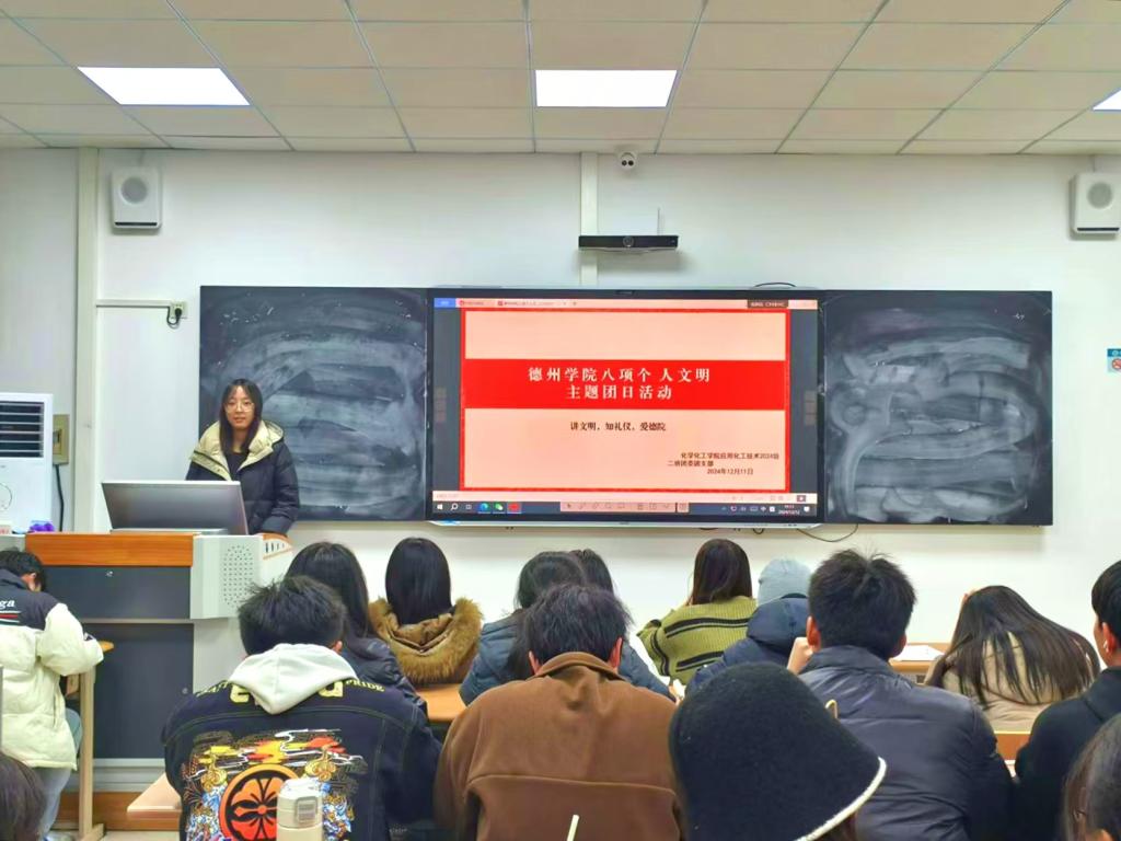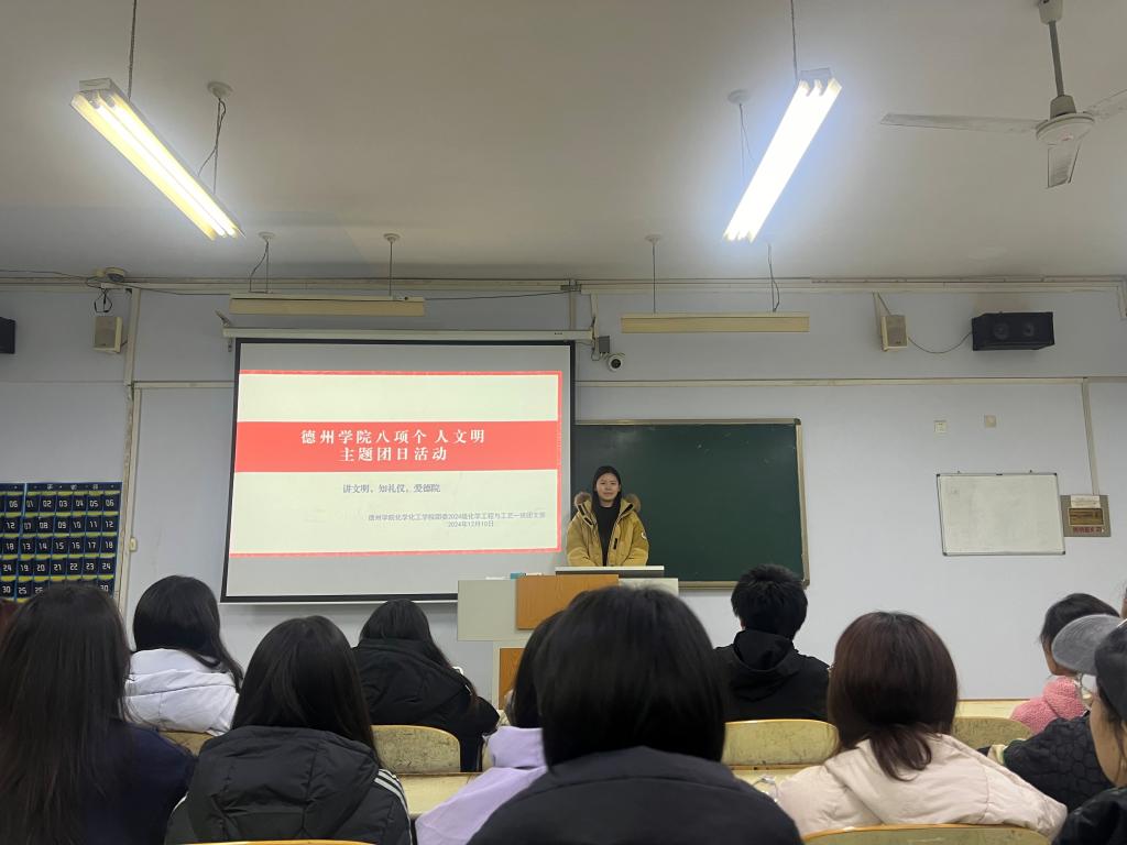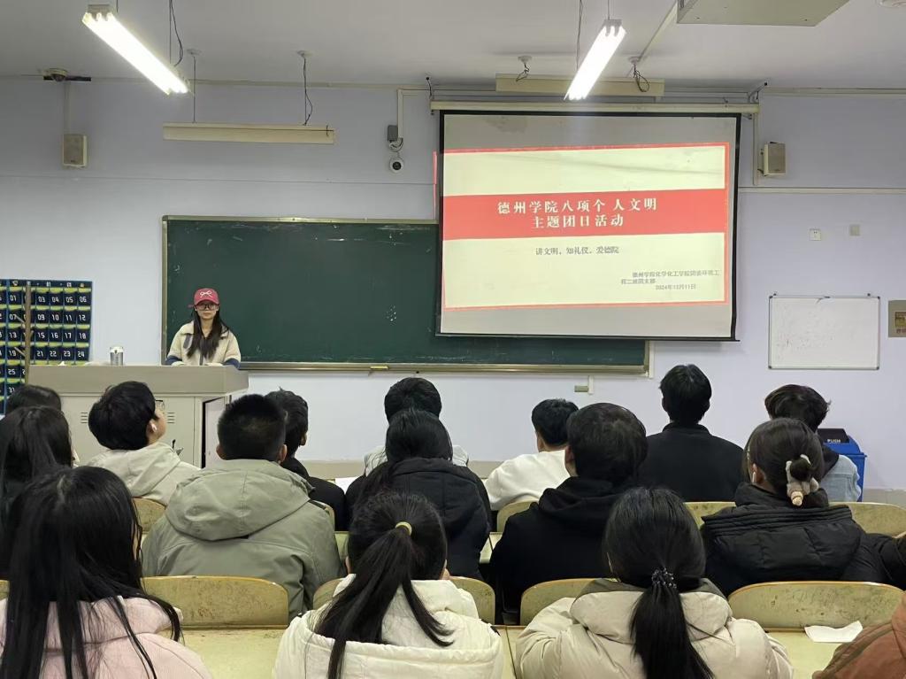 为贯彻落实党的二十届三中全会精神,加强我院大学生思政工作,强化文明养成与校风学风建设。12月10日,人人爽人人爽于求实楼开展“八项个人文明”主题团日活动。各班团支书主持,人人爽人人爽全体学生参加。