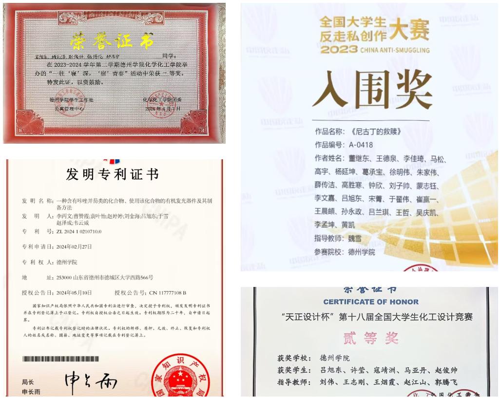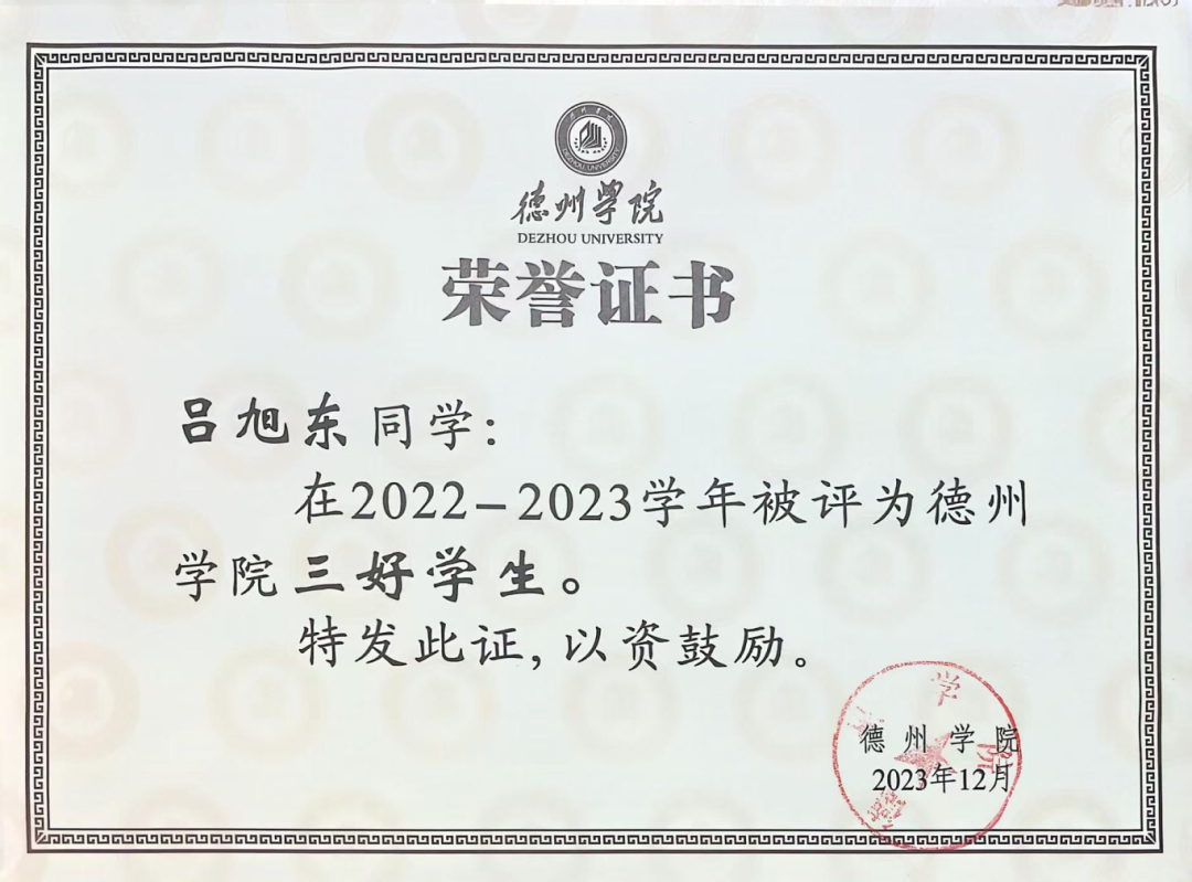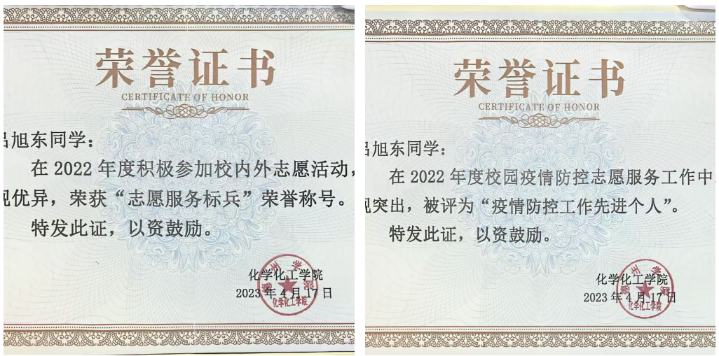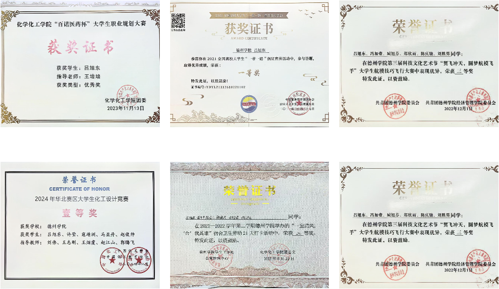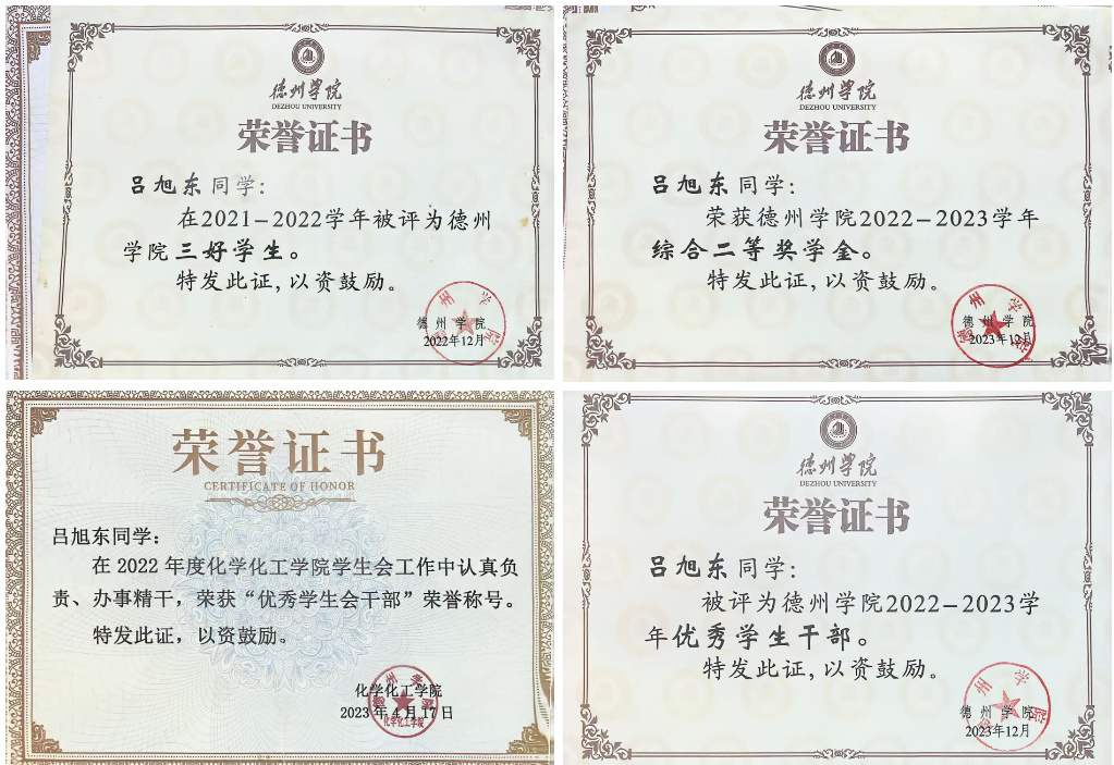 吕旭东始终把学习放在首位,入学以来,对于学习从未松懈,刻苦学习,连续三年获得奖学金;在日常学习中,作为学习委员,他主动为班级同学进行答疑解惑,保持班级优良学风。在科技创新方面他积极进取,力求上进;曾获“一种含有咔唑并芴类的化合物,使用该化合物的有机发光器件及其制备方法”国家级发明专利、第十八届天正设计杯化工设计大赛全国二等奖、第十八届天正设计杯化工设计大赛华北赛区一等奖,全国一带一路宣传一等奖,第十八届挑战杯学术科技竞赛三等奖等。