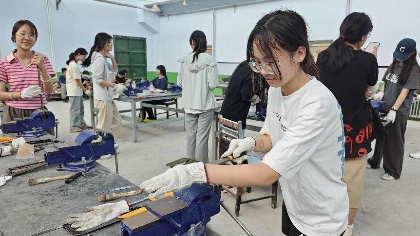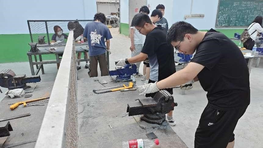 学生们通过实习学会了切料,将一块大钢板切出一块60×120 cm的钢板。掌握锯子和锉刀的使用技巧,并进行正方配切割的实践操作。切割完成后,使用锉刀对切割边缘进行修整,去除毛刺和不平整部分。最后,对金属板进行质量检查,确保正方形都符合图纸要求。学生评价说,金工实习让自己获得了满满的成就感。