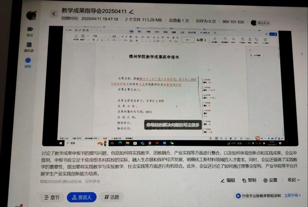 指导会通过线上会议形式召开。江汉森教授分享了从选题培育到成果转化的全流程实践经验,特别强调了成果奖选题的重要性。分享了其整合优质教学资源开展教学成果奖申报经验,并对申报书进行了针对性的剖析和指导,为参会教师提供了多维度的专业指导。