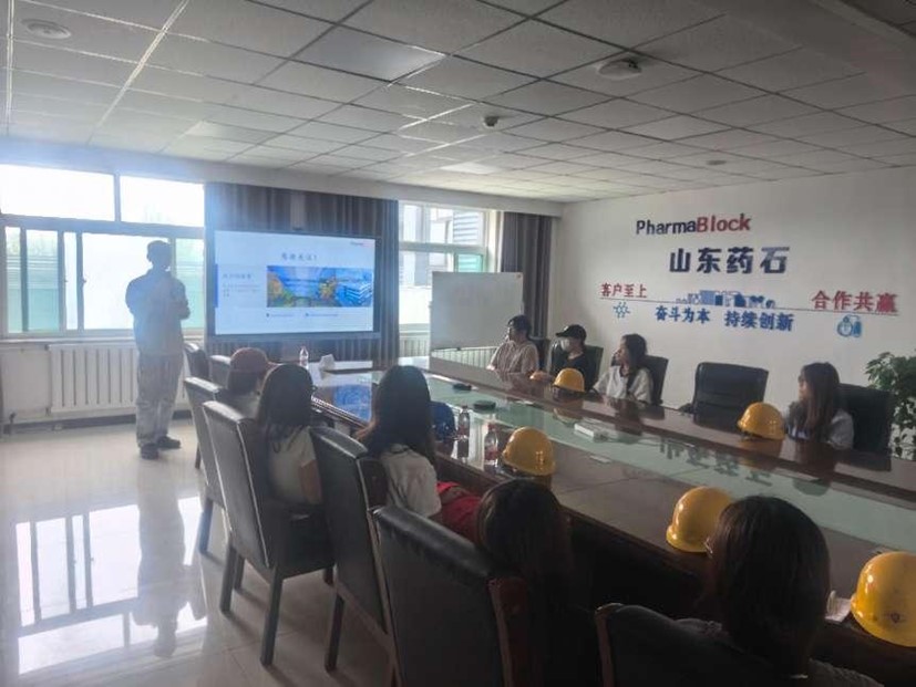 抵达山东药石药业有限公司后,在公司二楼会议室召开了欢迎会,公司副总致欢迎辞,希望同学们通过这次实习,对医药中间体合成、山东药石药业有一个更加全面、更加深入的认识,也随时欢迎各位同学来山东药石就业、创业。随后,公司人力资源部刘经理、德州学院人人爽人人爽2015届校友,研发部主任陈程,德州学院人人爽人人爽2014届校友,安全主管谷雨围绕公司情况、项目建设、产品工艺流程、安全注意事项、发展规划等五个方面向大学生们做详细讲解。
