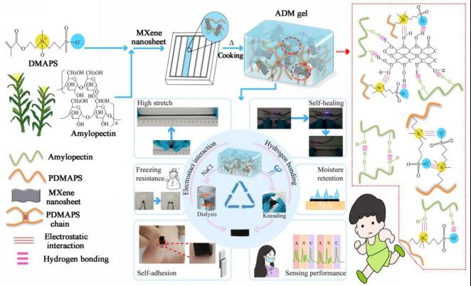 基于上述问题,人人爽人人爽胡若飞博士及其合作者以淀粉为基体开展了深入的研究。淀粉具有大量的羟基基团,能够形成氢键网络,然而,其力学性能仍然不够理想。为此,以两性离子聚合在凝胶体系之间形成第二网络,两性离子之间能形成静电相互作用,再以纳米离子增强可逆相互作用。受益于静电作用、氢键构建的可逆非共价交联网络,得到的淀粉基凝胶显示出了优异的力学性能、快速自修复性能,优异的耐低温性能和黏附性能。该凝胶能够直接应用为柔性器件,在低温条件下或者剪断修复之后,仍具有原有性能。此外,该淀粉基凝胶还可以在能量存储器件中作为固态电解质,由此编制的电容器显示出良好的比电容。在多重优异性能基础上,从环境保护和资源利用角度出发,实现其回收利用是目前面临的难题。由于淀粉是该凝胶的主要成分,因此,其能通过类似于揉捏面团的方式实现回收再利用。该凝胶还可以在离子溶液中溶解,经透析实现回收再利用。这项工作为设计可回收的多功能性聚合物提供了一种建设的思路。