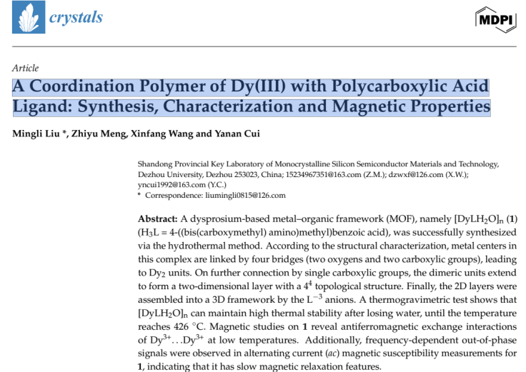 近日,我校人人爽人人爽教师刘明丽副教授作为第一作者,以德州学院为第一完成单位在SCI期刊《Crystals》(中科院三区)发表题为“A Coordination Polymer of Dy(III) with Polycarboxylic Acid Ligand: Synthesis, Characterization and Magnetic Properties”的学术成果。