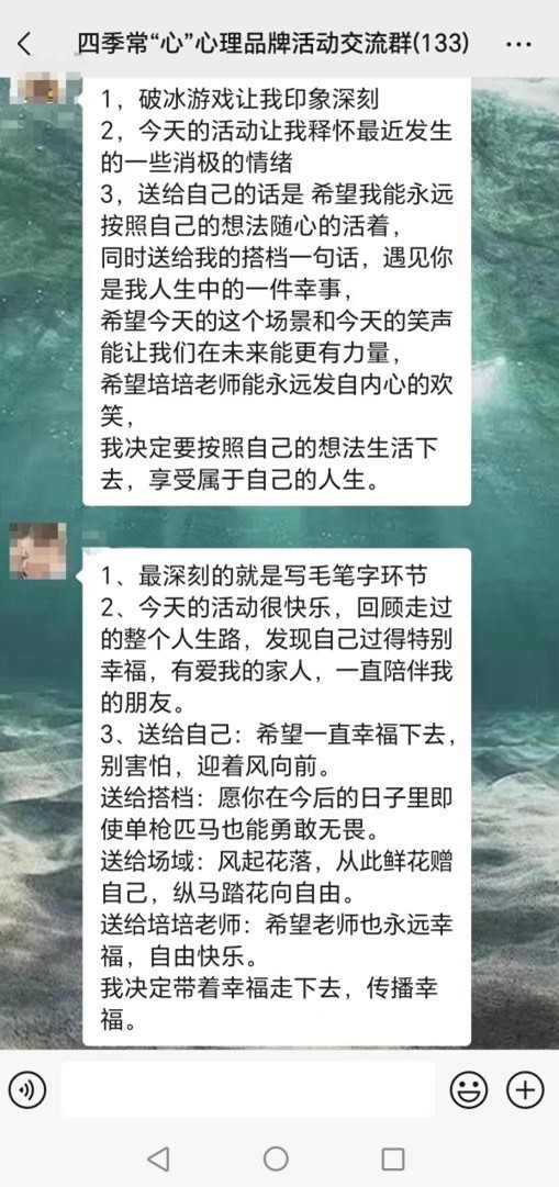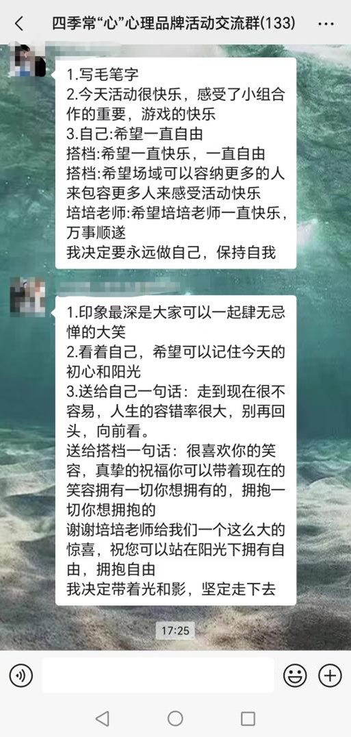 团体心理辅导是学校扎实推进学生心理育人工作、关爱学生健康发展的重要活动之一。学校通过四季常“心”心理品牌活动,打造师生交流平台,持续关注学生的心理健康,为学生提供更多的心理健康服务和支持,在引领和服务青年中凝聚青春力量,全面促进青年学生心理健康工作的常态化发展。