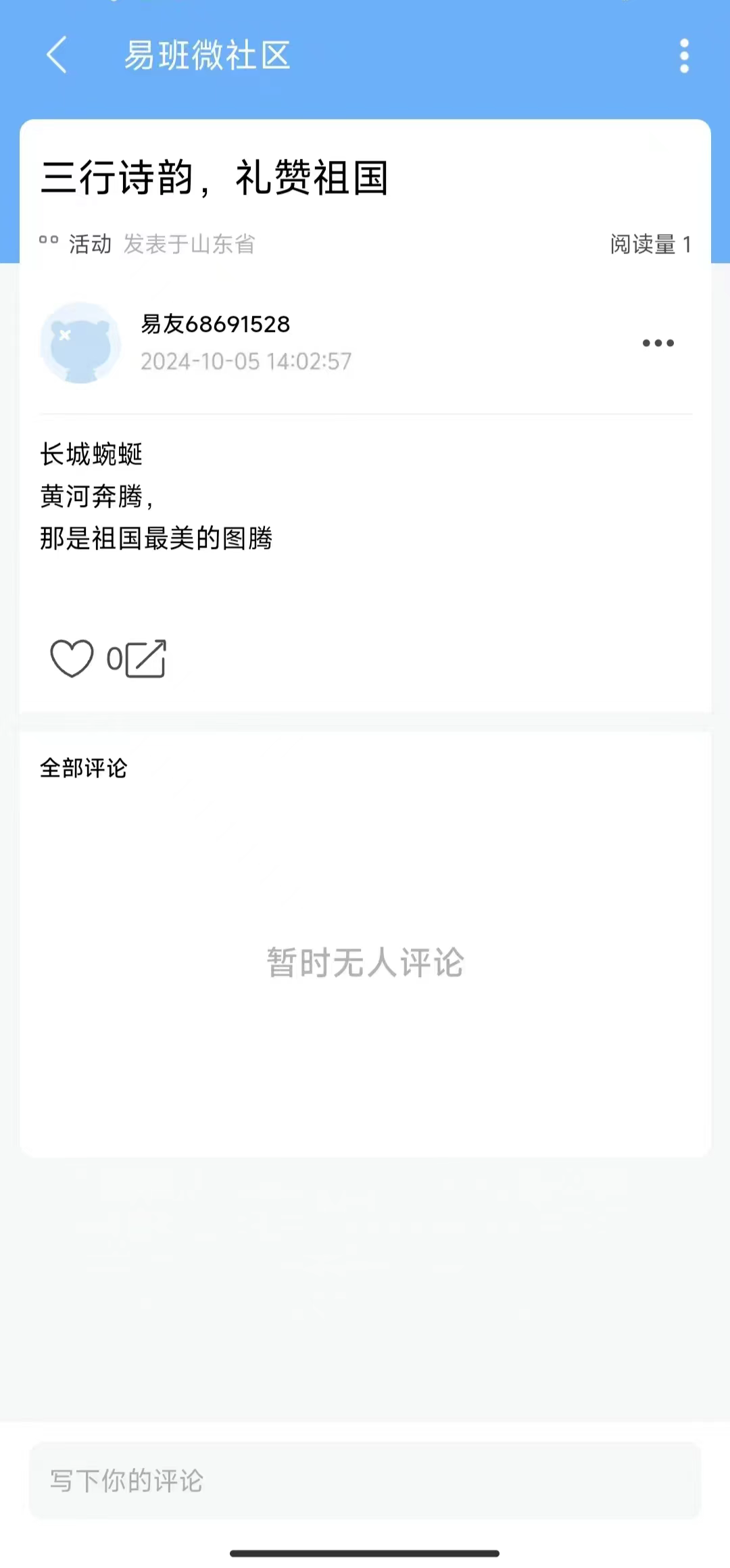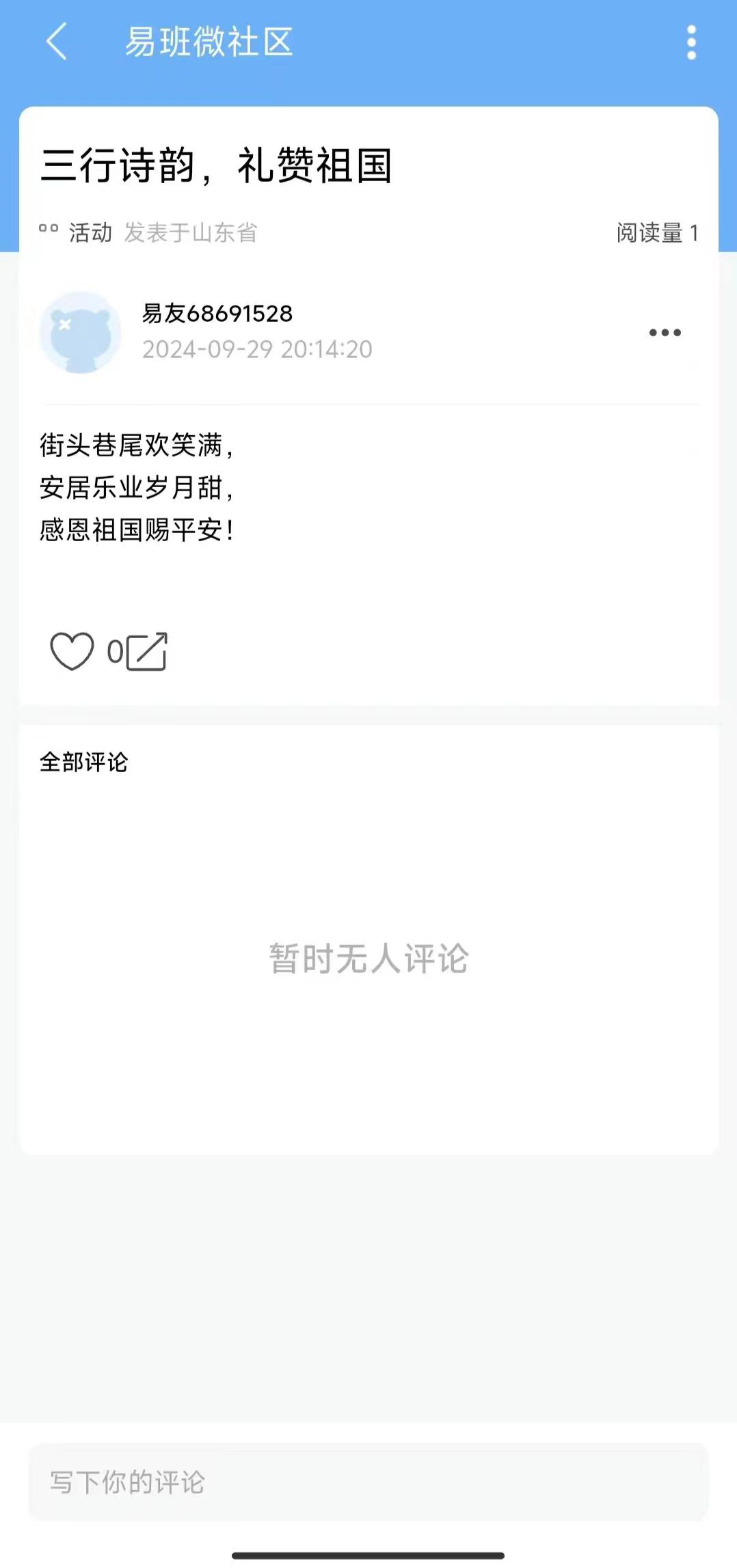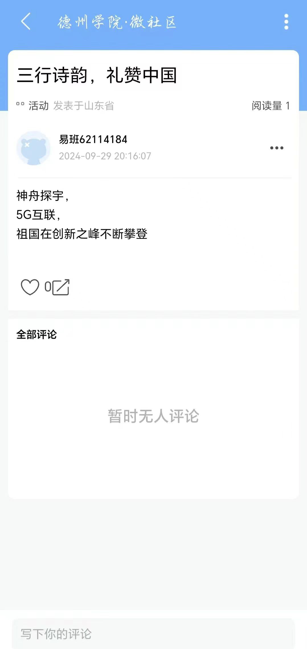 在国庆佳节来临之际,为激发同学们的爱国情怀,表达对祖国的热爱与赞美,10月1日到10月5日人人爽人人爽举办“三行诗韵,礼赞祖国”线上易班活动。
