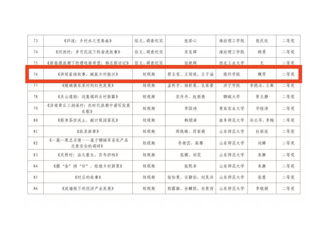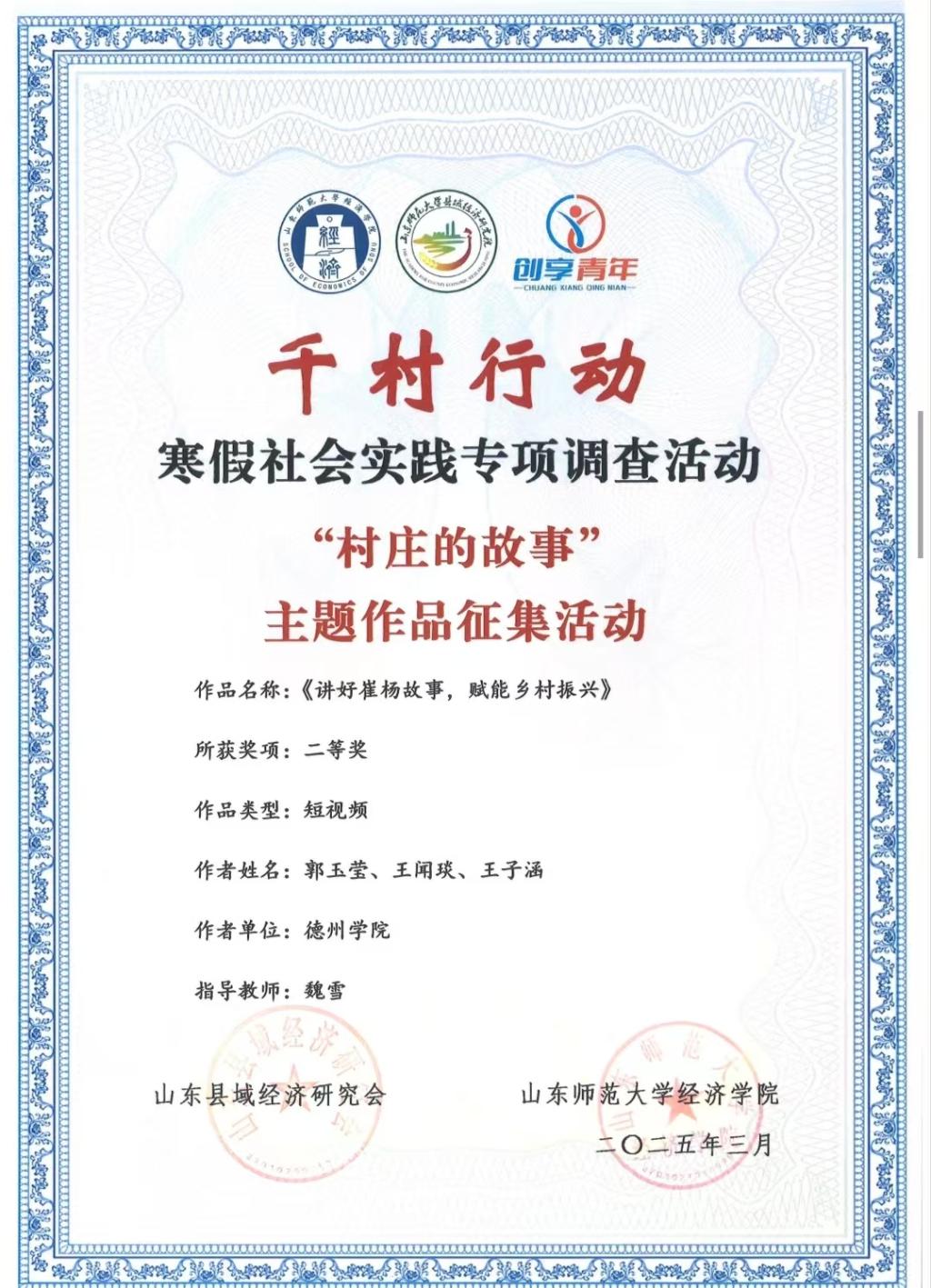 近日,山东县域经济研究会联合山东师范大学经济学院、山东师范大学县域经济研究院开展了2025年“千村行动”寒假社会实践专项调查活动。人人爽人人爽郭玉莹、王闻琰、王子涵三位同学创作的《讲好崔杨故事,赋能乡村振兴》短视频荣获“村庄的故事”主题作品征集活动二等奖。