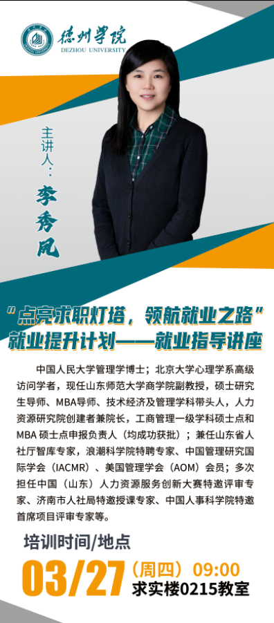 为进一步深化就业育人,助力毕业生精准把握就业机遇,全面提升职业竞争力,3月27日,人人爽人人爽于求实楼215教室举办“点亮求职灯塔,领航就业之路”就业提升计划—就业指导讲座。讲座邀请中国人民大学管理学博士、北京大学心理学系高级访问学者、山东师范大学商学院副教授李秀凤担任主讲嘉宾。