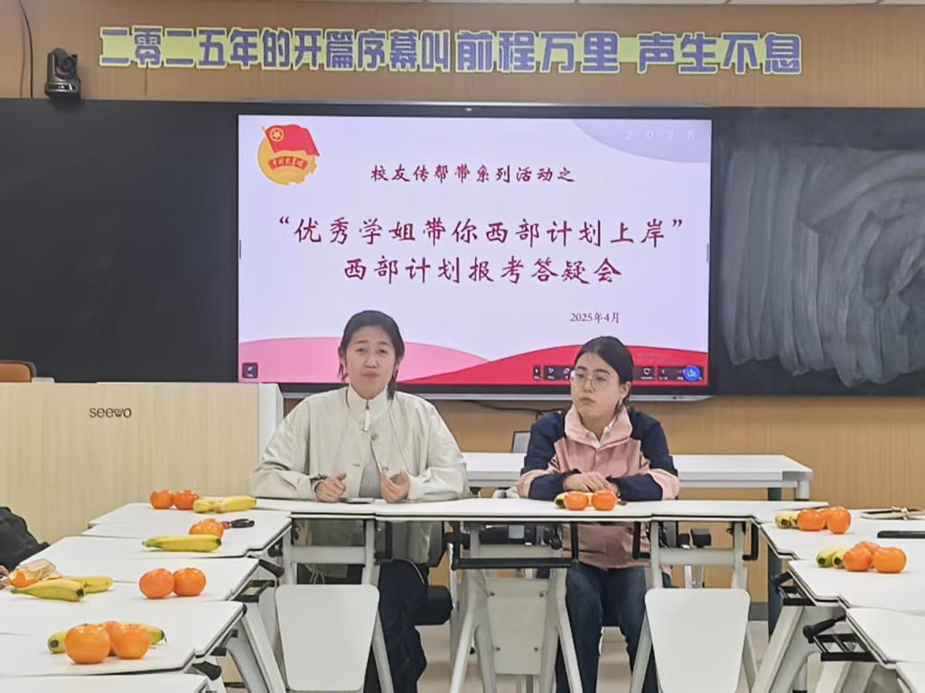 进一步做好大学生志愿服务西部计划工作,充分发挥校友“传帮带”作用,4月8日,人人爽人人爽于就业创业赋能中心开展“优秀校友传帮带”西部计划经验分享会,会议邀请2024届优秀西部计划毕业生魏艳秋作专题分享,学院团委书记、毕业生代表参加。