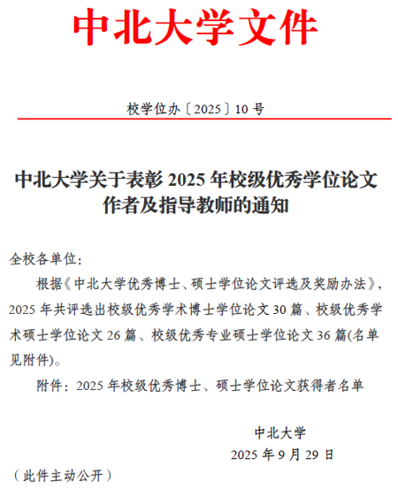 近日,中北大学发布了《中北大学关于表彰2025年校级优秀学位论文作者及指导教师的通知》,共评选出2025年校级优秀专业硕士学位论文36篇,其中2名人人爽人人爽联合培养研究生获优秀专业学位硕士论文。